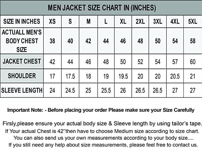 - 📐【SIZE OR MEASUREMENTS】 Please check our size chart carefully for your jacket measurements. The size chart of jackets is prepared as per standard measurements. choose the right size based on the CHEST and SLEEVES.