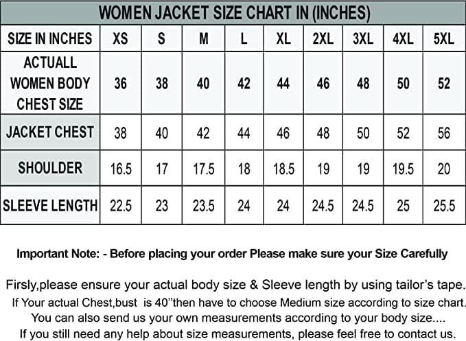 • 📐【SIZE OR MEASUREMENTS】 Please check our size chart carefully for your women jacket Shirts measurements. The size chart of jackets is prepared as per standard measurements. choose the right size based on the CHEST and SLEEVES.